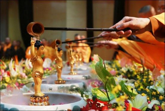 以勺盛满香汤,从佛像顶浇灌而下。边浴佛边念诵