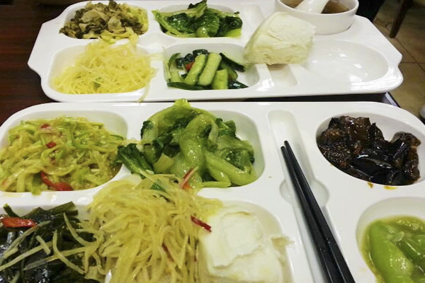 虽然这仅仅是一家自助快餐店,但从定价和质量我们能看出老板是佛面善心。他用公德心在推广素食和健康的理念。吃完饭你需要自己把碗筷收拾到餐厅最后方,如果你不知道情况,也不会有人呵斥你,店员会默默地将它们全部收走。在店内进门的地方,有一个书柜可以用于善书结缘和赠送。书本囊括国学经典,禅修等内容。所有书本都可以免费拿走,但是你也可以往功德箱里随喜一下。就是这样一家小小的素菜馆,备受年轻白领们的喜爱,掀起了南京城的食素热潮。