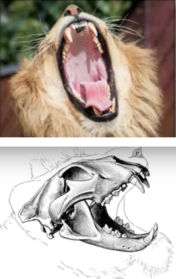 肉食性动物一般可以把口张到很大很大,比如可以吞下比自己身体大很多倍食物的蛇。肉食性动物下巴开合连接的部分是活动的关节,有的动物在开合的部分甚至是一块肌肉,灵活但稳定。下颌与牙齿几乎处于同一平面——臼齿几乎就在下巴的左右两侧。