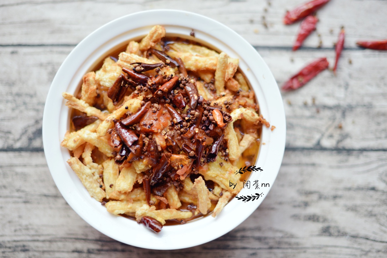 再起锅放底油,慢火炸香麻椒和辣椒,泼在腐竹上。