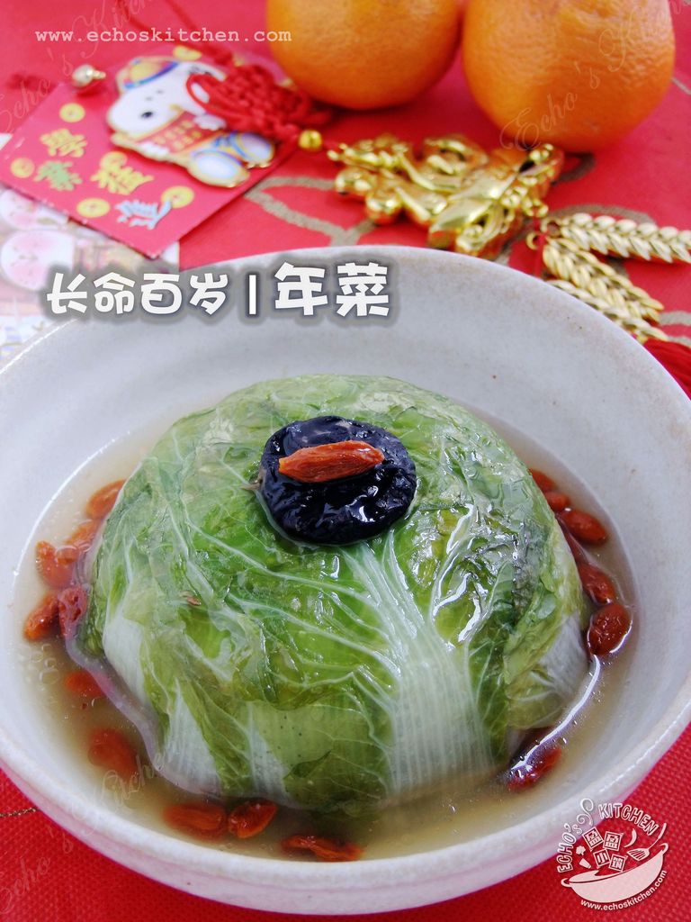 我们家过年时大年初一是必须要吃素的,老人家的说法是大年初一茹素可保一整年平安。不过我认为那是因为年除夕吃了太多的大鱼大肉,让大家第二天茹素清清肠胃,减缓肠胃的负担。大过年的,大人们就想出初一茹素可保平安的说法,讨个吉利。每年的年菜里,都一定要有一款大白菜(闽南话叫长白),而且菜不能横向切断,只能纵向撕开,象征长命百岁,家里每人都必须至少吃上一根才能离桌。这款素菜是我用了整叶的白菜和素面筋制作的,取阿嬤在生时的要求与寓意,希望家人吃了可以长命百岁。可以年除夕时作为年菜,也可以年初一茹素时吃,很是不错。