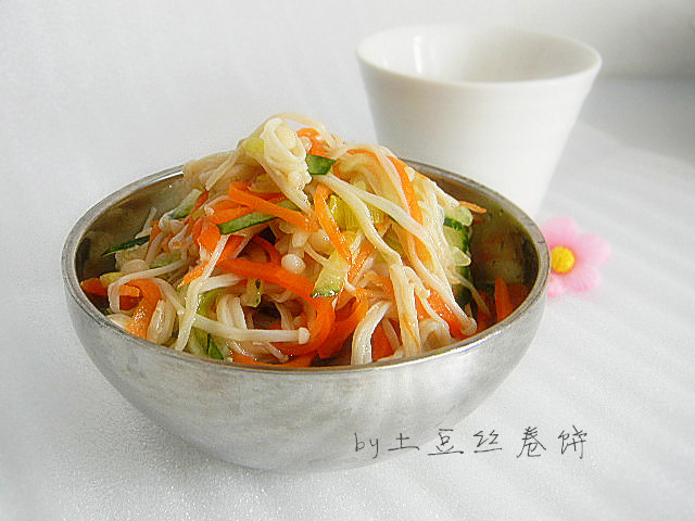 黄瓜丝放入金针菇胡萝卜一起。