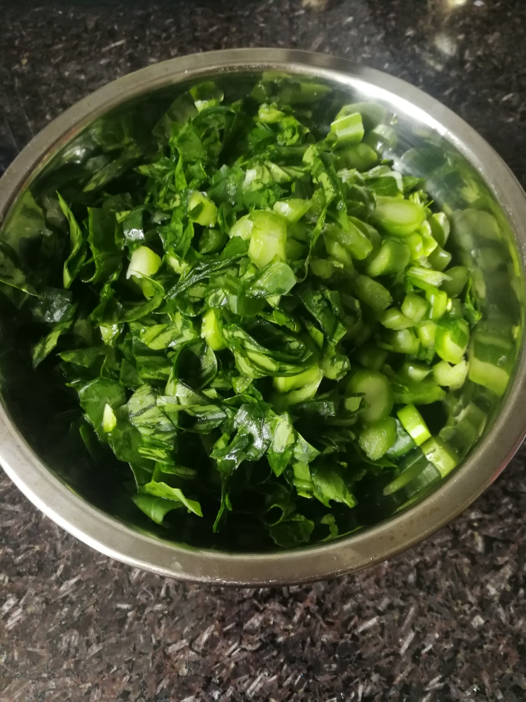 芥兰洗完切碎,热油后下锅翻炒,同时添加配料。