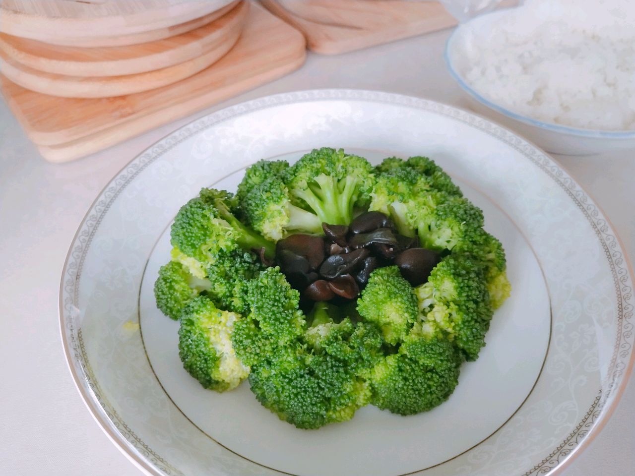 把西兰花先放在外围一圈,然后黑木耳放在中间摆盘完成。