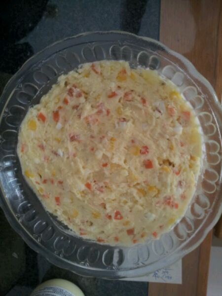 鸡蛋、玉米、胡萝卜煮熟,胡萝卜切成小丁,玉米剥出来,鸡蛋可以手捏碎,刀切的会有铁锈味。