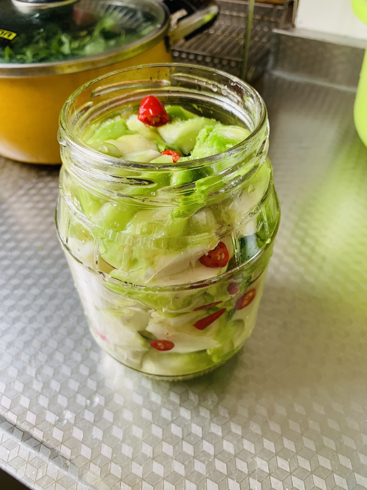 隔天,将儿菜装瓶。倒点白糖。红辣椒。白醋。
