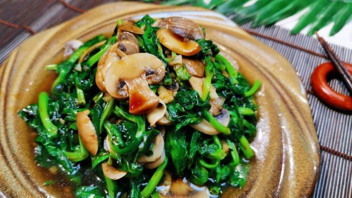 淋上一点点海鲜酱油,拌一下极好吃金银蒜和豌豆尖的香味结合蘑菇滑滑嫩嫩的