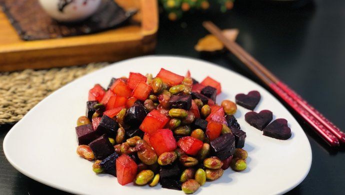 一道艳丽的甜菜根炒双豆(毛豆和土豆) 净素食
