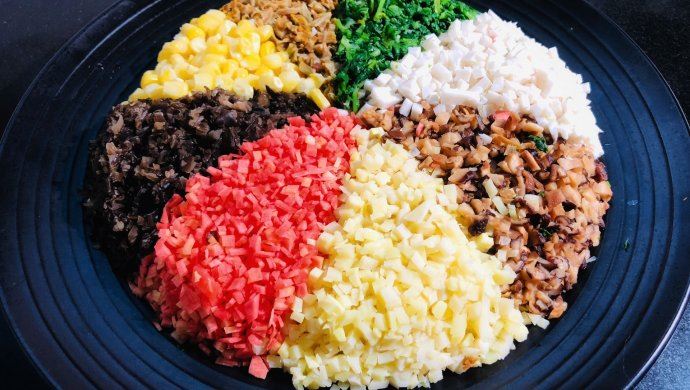 何谓净素?谓之无蛋奶和五辛之物~何谓八珍?八种食材的组合而已……年前做过一回净素八珍馅,老友一直替吃素的同事讨方子,其实就是凑八种食材而已现在是非常时期手边没有当时的食材了,就随手抓几样凑个数,看上去也不错