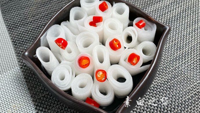 将萝卜刮除外皮清洗干净~再用刨子刨出薄片~