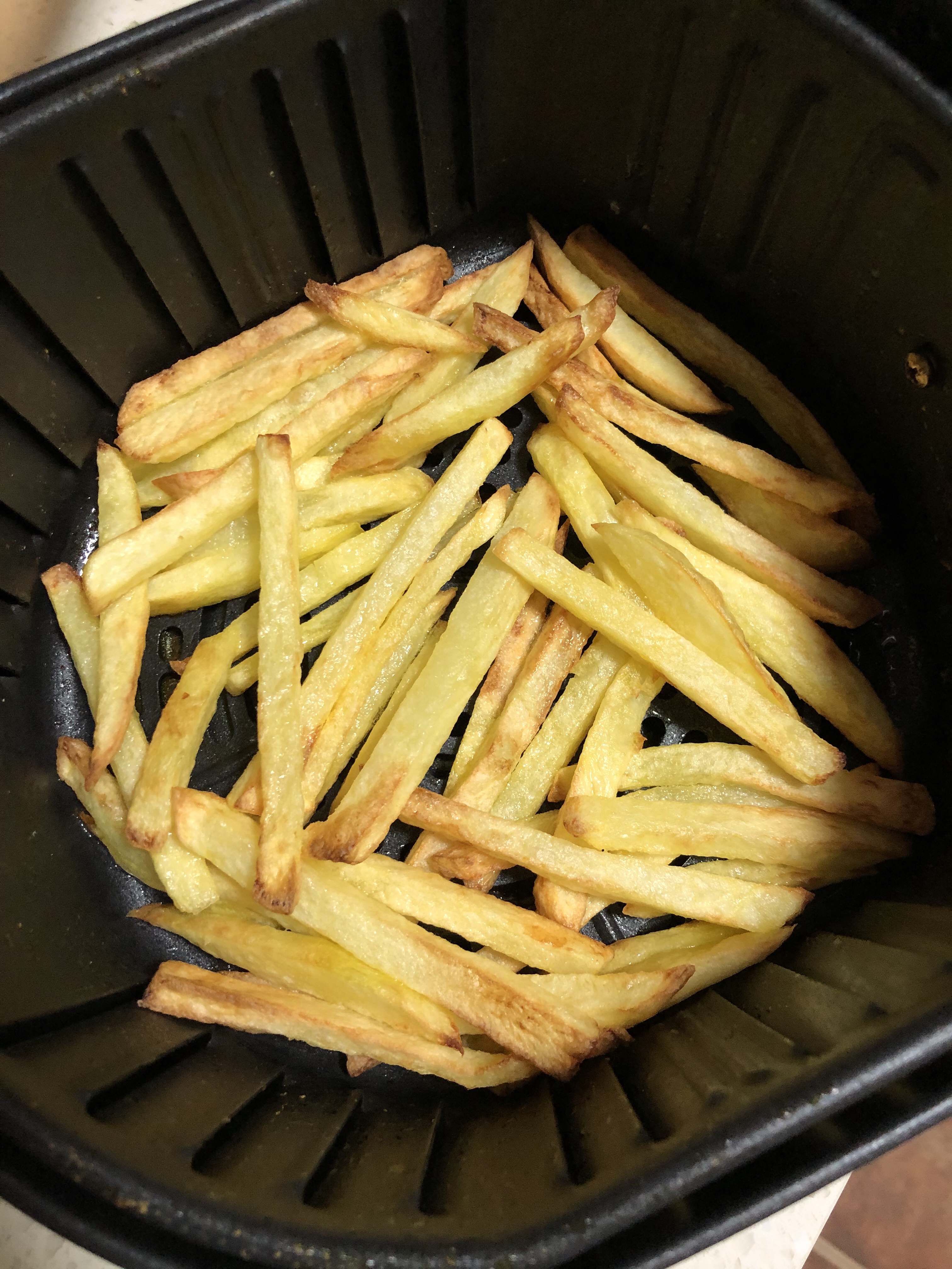1、那些又是厨房纸、又是放凉、又是冰箱冷冻的方法,完全就是多此一举。2、一定要放油和淀粉,不然口感差很多,不好吃 & 正常效果应该是我图片那种,看起来和油炸的没区别。3、薯条量最好铺平炸锅就行,太多太厚、受热不均匀,有的都成干了,有的还没形成脆皮