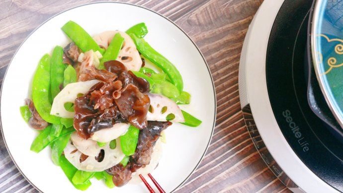 莲藕去皮切好,荷兰豆去丝,木耳提前泡发~并清洗干净备用